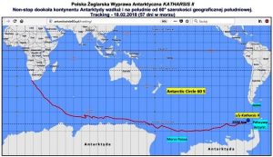 On 14 February 2018, after 53 days and 10 hours, having travelled 7,975 nautical miles since leaving Cape Town, Republic of South Africa, Katharsis II crossed the meridian halfway point on her voyage around Antarctica, the finishing line set for Hobart, Australia. The latitude of 97o07’E was the meridian in question. Four days before, Katharsis II, continuously sailing south of the 60th parallel, crossed one half of the 360 meridians required to close the Antarctic loop. Since crossing the 60th parallel south, that is since entering Antarctic waters, crossing one-half of the Antarctic loop took us 35 days and 20 hours. During the first half of our journey, the average daily run totalled 149.3 nautical miles, much higher on the leg from Cape Town to the 60th parallel (171.7 nautical miles), and lower in the Antarctic between the 60th and 70th parallels (141.8 nautical miles). Navigating eastward on Antarctic waters is observably slower than sailing eastward on the Southern Ocean, further away from the Antarctic.
